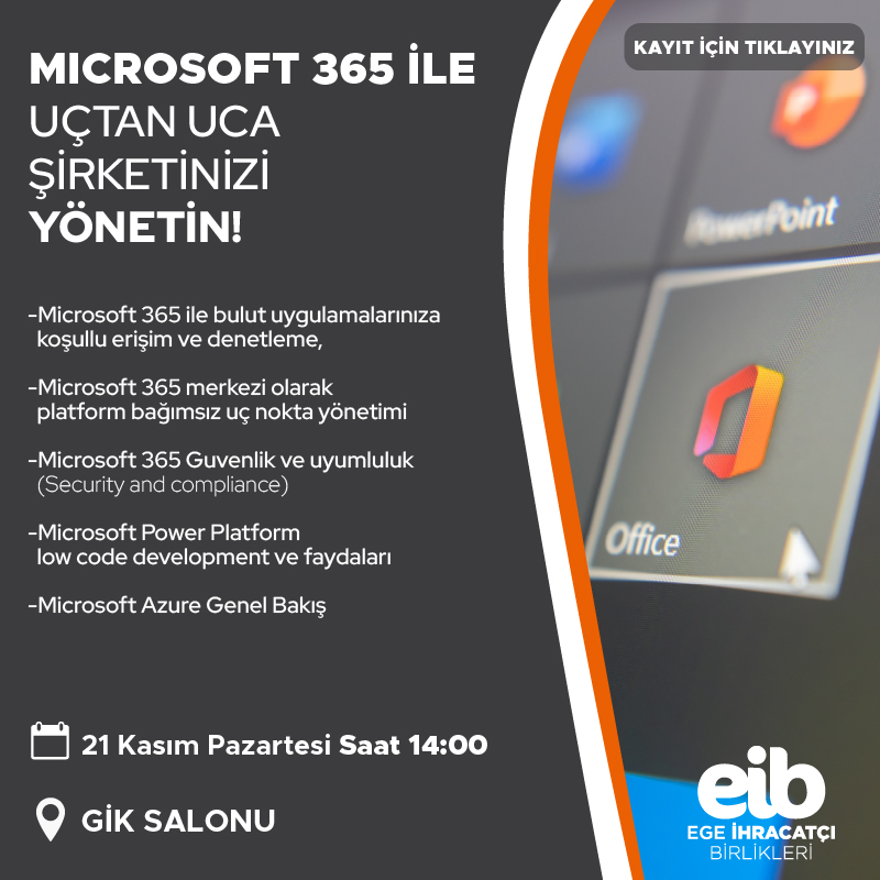 EĞİTİM/SEMİNER // Microsoft 365 ile Uçtan Uca Şirketinizi Yönetin 8 Kasım 2022 Salı Ayrıntılı bilgi ve kayıt için görsele ya da buraya tıklayınız.Ayrıntılı Bilgi İçin: Yiğit Paker