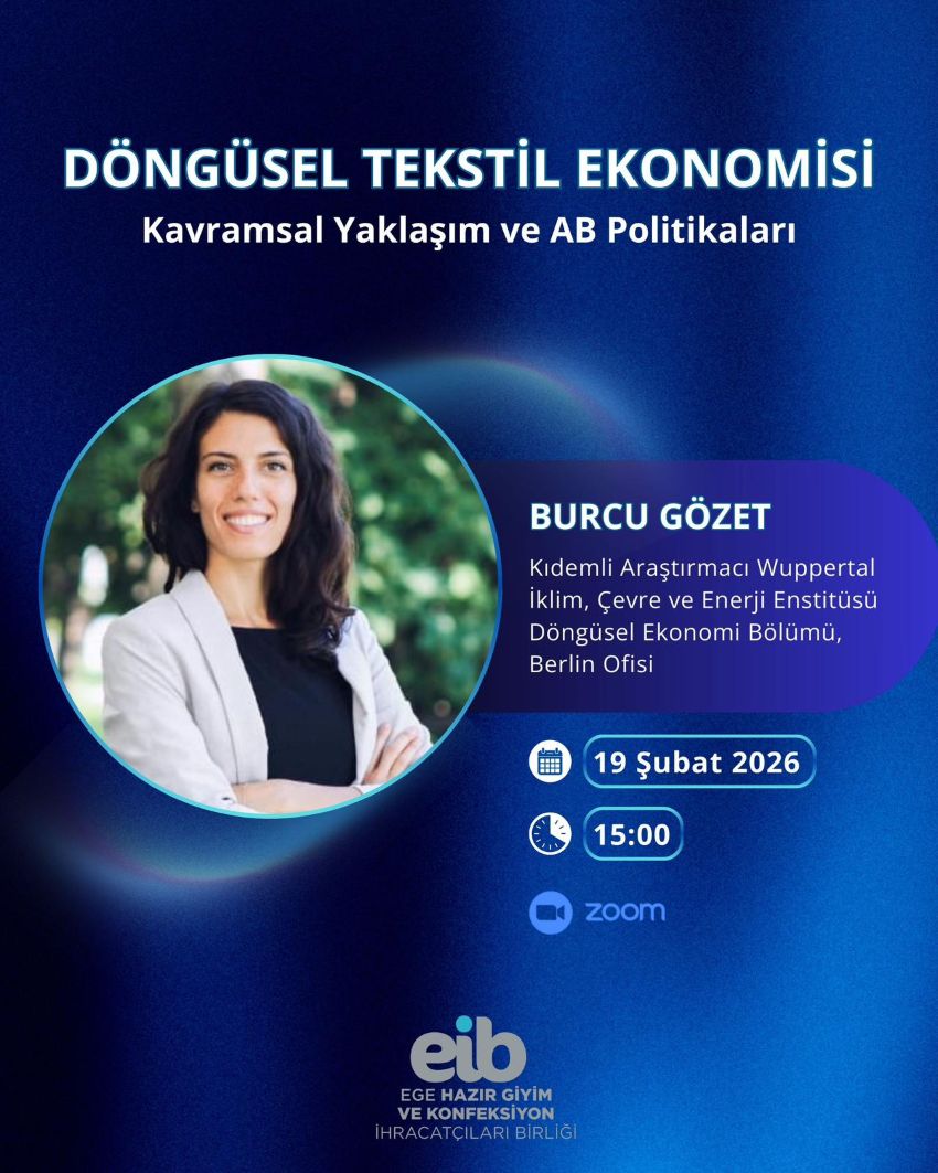 Ege Hazır Giyim ve Konfeksiyon İhracatçıları Birliğimiz tarafından, 19 Şubat 2026 Perşembe günü saat 15:00’de, Wuppertal İklim, Çevre ve Enerji Enstitüsü Döngüsel Ekonomi Bölümü Berlin Ofisi Kıdemli Araştırmacısı Burcu Gözet’in konuşmacı olacağı “Döngüsel Tekstil Ekonomisi Kavramsal Yaklaşım ve AB Politikaları” konulu bir webinar düzenlenecektir.