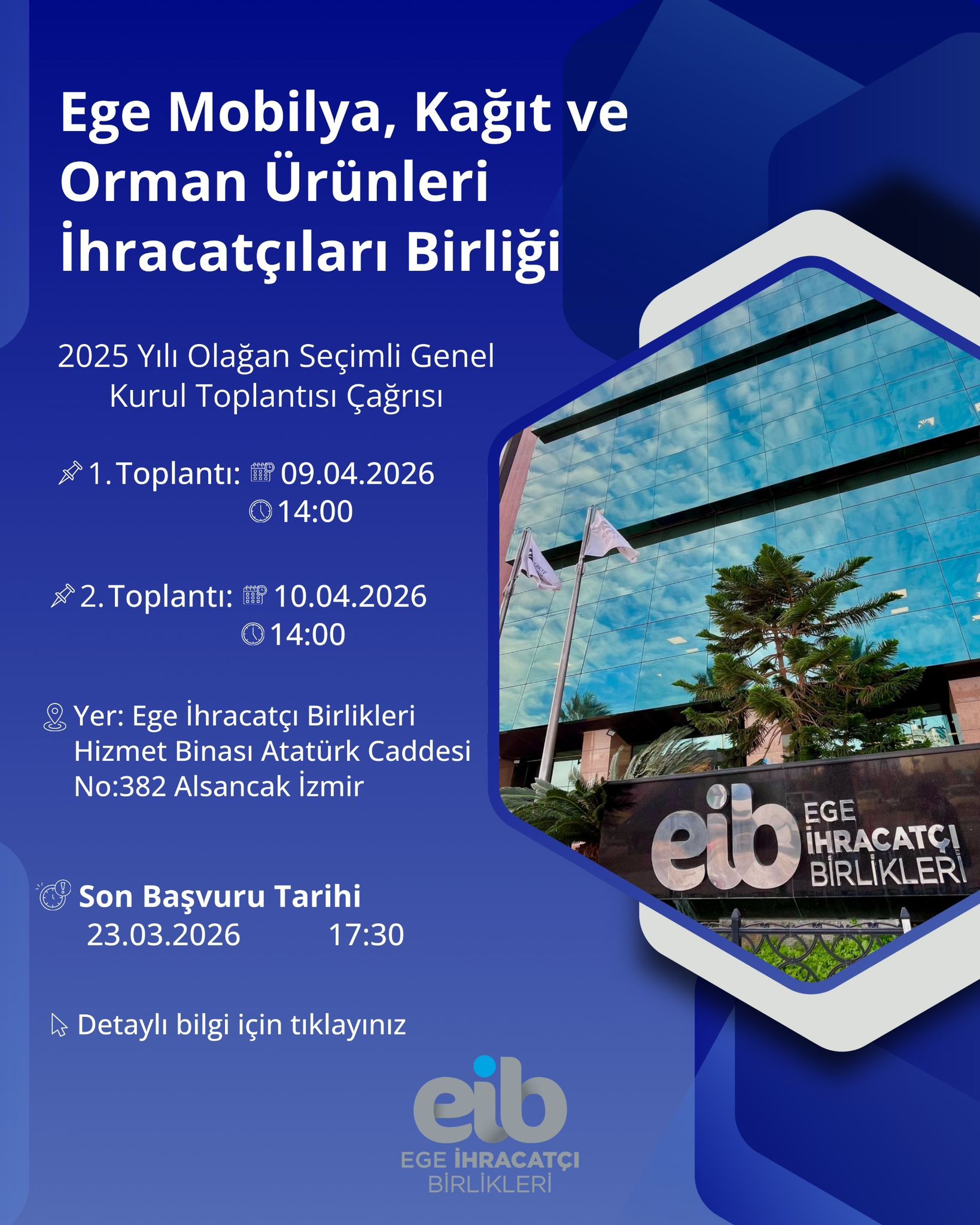 TOPLANTI // EMKOÜİB 2025 Yılı Olağan Seçimli Genel Kurul Toplantısı 26 Şubat 2026 Perşembe Ayrıntılı Bilgi İçin: Esmanur Abacılar