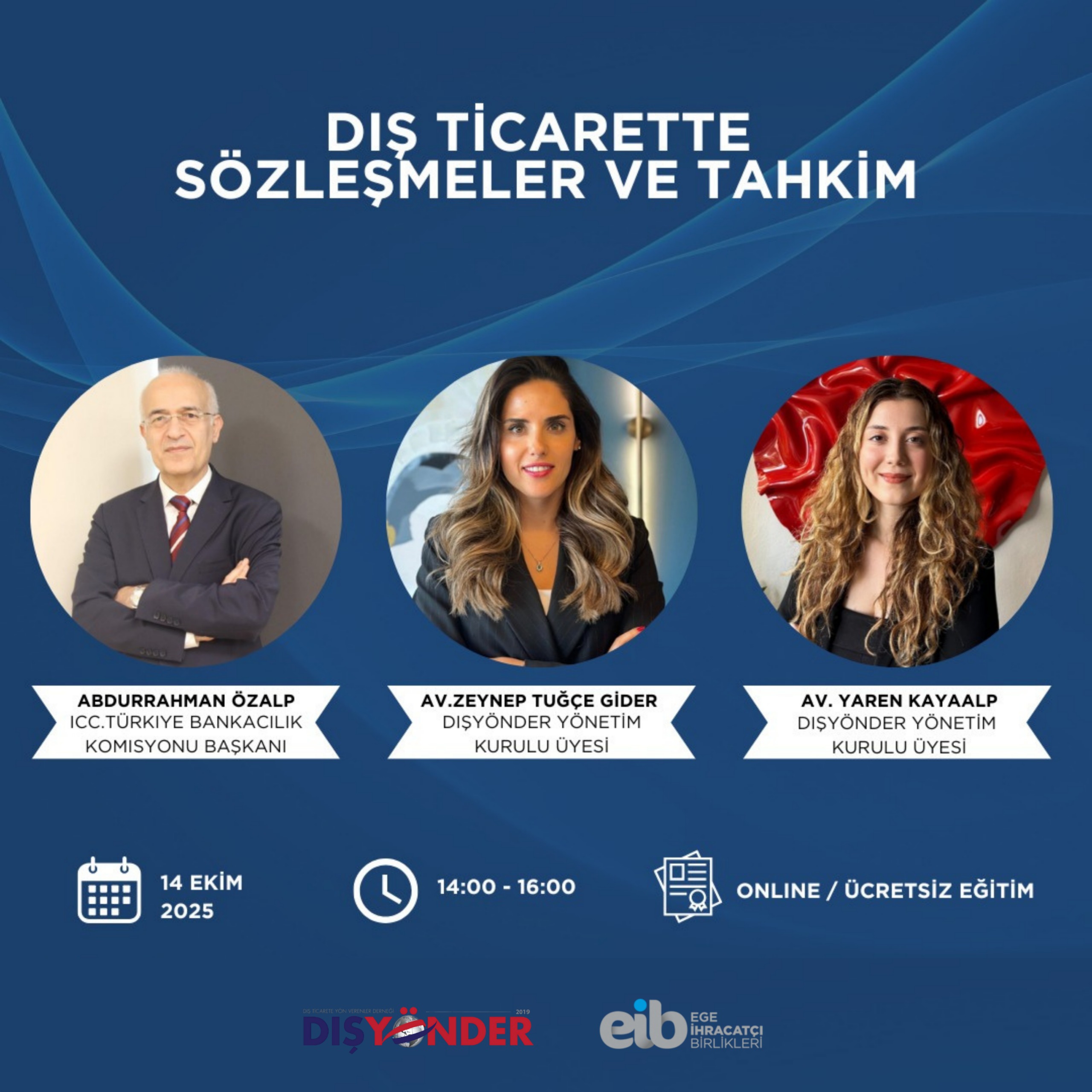 Ege İhracatçı Birlikleri ve Dışyönder iş birliğiyle 14 Ekim 2025 Salı günü 14.00–16.00 saatleri arasında “Dış Ticarette Sözleşmeler ve Tahkim” konulu çevrimiçi bir bilgilendirme toplantısı düzenlenecektir.