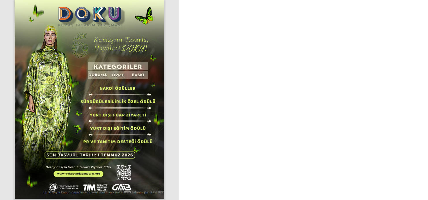Dokuma kumaş, örme kumaş ve baskı kumaş olmak üzere 3 ayrı kategoride düzenlenen Doku Kumaş Tasarım Yarışması için son başvuru tarihi 1 Temmuz 2026 olup yarışma afişi ekte yer almaktadır. Yarışmaya ilişkin detaylı bilgi ve başvuru için aşağıdaki bağlantılardan faydalanılabilmektedir.