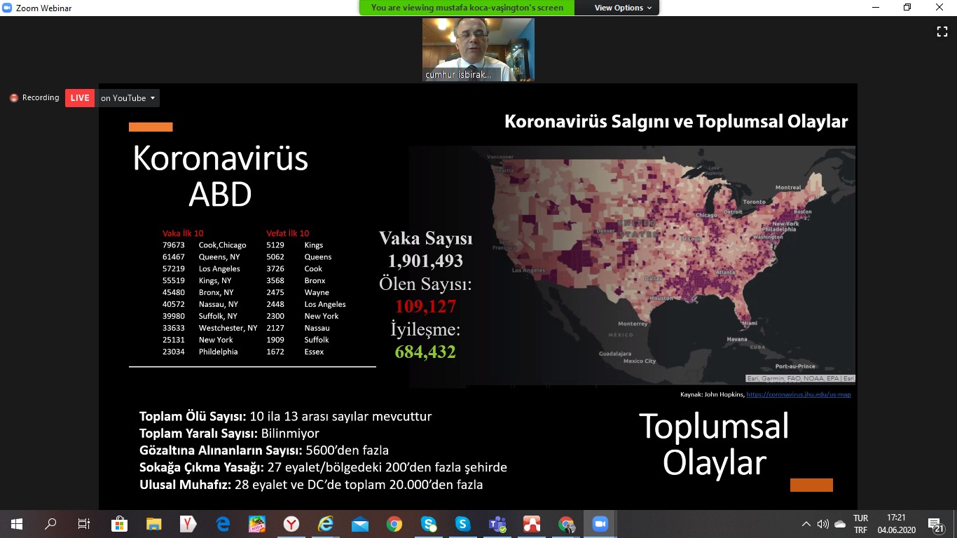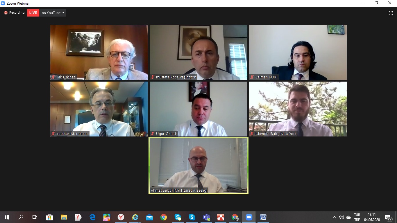 Türkiye'nin Vaşington Ticaret Baş Müşaviri Mustafa Koca, Vaşington Ticaret Müşaviri Selman Kurt, Chicago Ticaret Ataşesi Uğur Öztürk, New York Ticaret Ataşeleri Ahmet Nalbant ve İskender Balcı Amerika'da Covid-19'un etkileri ile ilgili bilgileri paylaştılar.